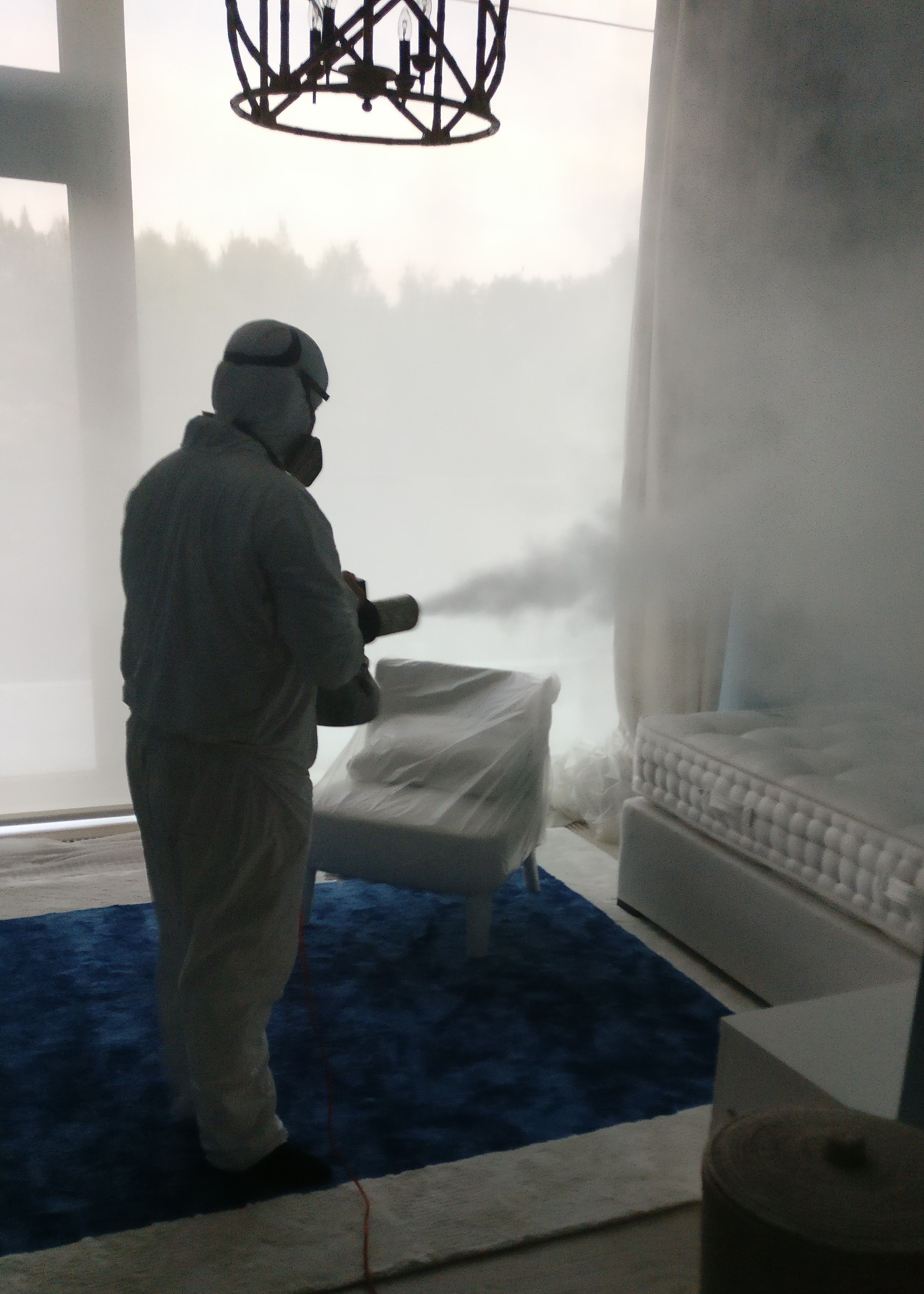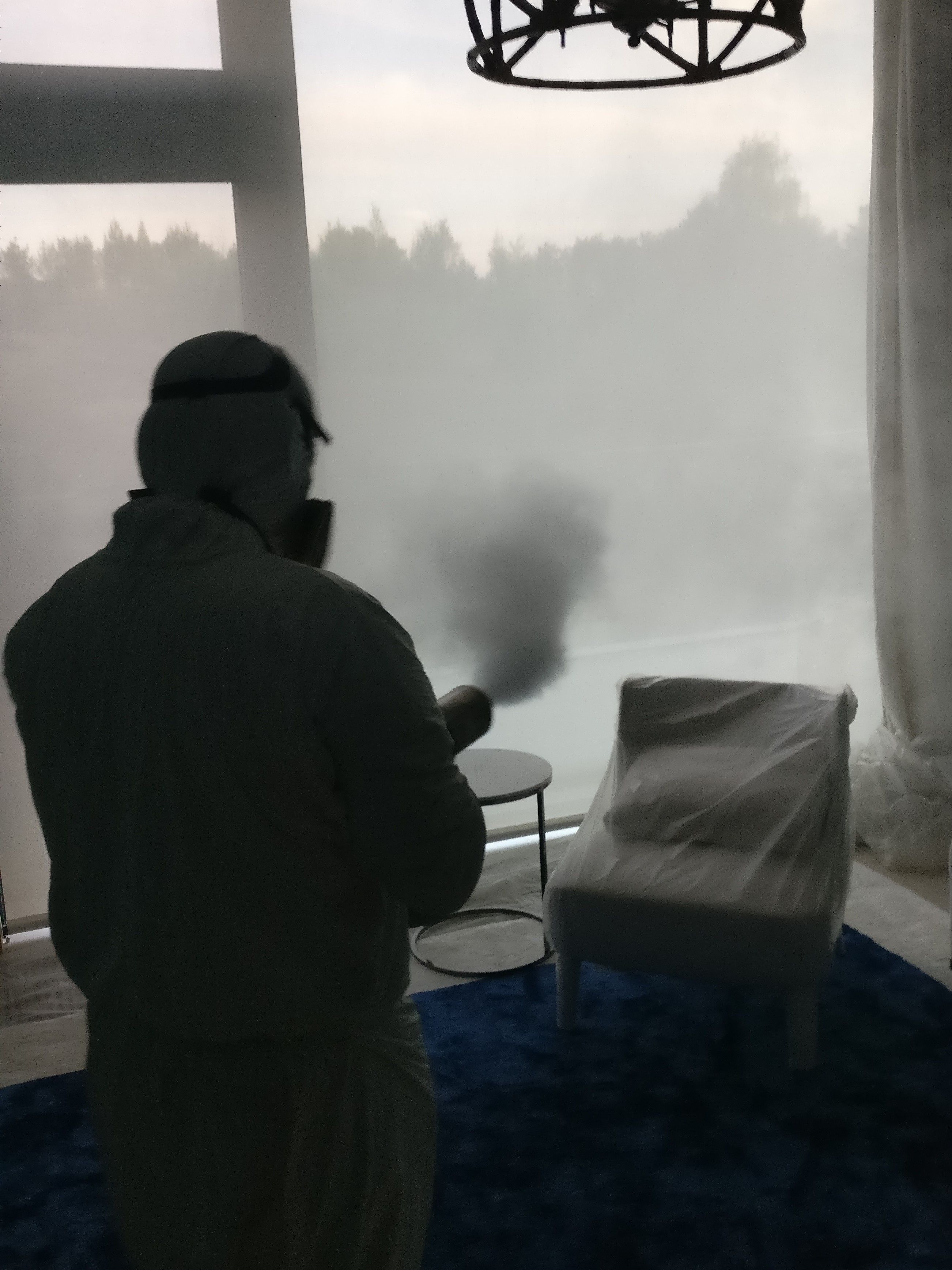 Суть этого метода состоит в следующем: посредством специального устройства распыляется особый состав, превращающийся в очень мелкие частички «тумана». По сути — это обычный дым. Основное преимущество данных частиц – это их микроскопические размеры. За счет этого, они проникают фактически в любые материалы и поверхности, куда физически не может добраться моющее средство или рука человека. Проникнув в структуру материала, данный состав разлагает химически источники запахов гари на безопасные воду и углекислоту. При этом, в отличие от способа озонирования, не начинается окисление материалов. Таким образом мебель и вещи не потеряют свои качества и цвет.